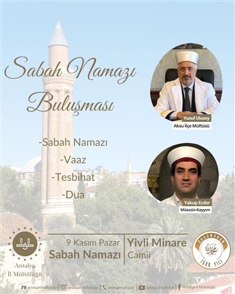 İlçe Müftüsü Yusuf ULUSOY Antalya'nın Muratpaşa ilçesinde yer alan ve 13. yüzyılda Selçuklu Sultanı I. Alaeddin Keykubad döneminde inşa edilen Yivli Minare Camiinde 09.11.2025 Pazar günü sabah namazı buluşmasında Cemaate hitap edecektir.