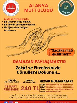 Alanya Müftülüğü, 2026 yılı Ramazan ayı münasebetiyle "Zekât ve Fitrelerinizle Gönüllere Dokunun" sloganıyla yardım kampanyası başlattı. Müftülüğümüz, hayırseverlerin bağışlarını ihtiyaç sahiplerine ulaştırmak üzere tüm hazırlıklarını tamamladı.