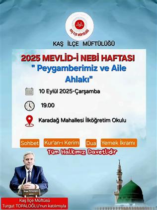 Mevlid-i Nebi Haftası etkinlikleri kapsamında Karadağ Mahallesi'nde gerçekleştirilecek olan "Peygamberimiz ve Aile Ahlakı " konulu programımıza tüm vatandaşlarımız ailece davetlidir.
