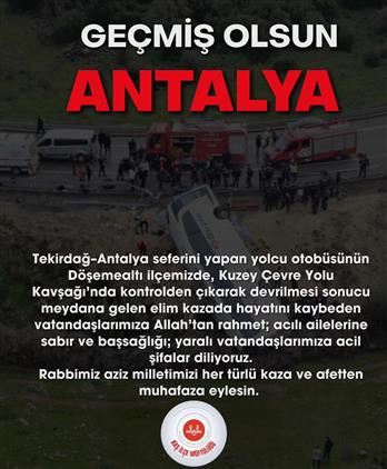Tekirdağ–Antalya seferini yapan yolcu otobüsünün Döşemealtı ilçemizde, Kuzey Çevre Yolu Kavşağı’nda kontrolden çıkarak devrilmesi sonucu meydana gelen elim kazada hayatını kaybeden vatandaşlarımıza Allah’tan rahmet; acılı ailelerine sabır ve başsağlığı; yaralı vatandaşlarımıza acil şifalar diliyoruz.
