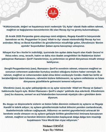 “Kültürümüzde, değeri ve hayatımıza tesiri nedeniyle ‘Üç Aylar’ olarak ifade edilen rahmet, mağfiret ve bağışlanma mevsimlerinin ilki olan Recep Ayı’na girmiş bulunmaktayız.