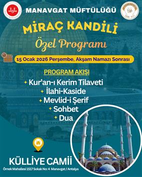 Tüm halkımızı 15 Ocak 2026 Perşembe günü akşam namazına müteakip Külliye Camii’nde düzenlenecek olan “Miraç Kandili Özel Programı”na davet ediyoruz.
