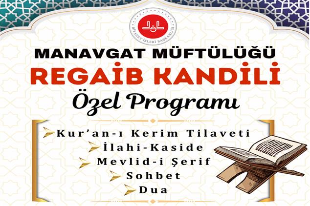 Manavgat Müftülüğümüz tarafından Regâib Kandili dolayısıyla 25 Aralık 2025 Perşembe günü akşam namazına müteakip Külliye Camii’nde “Regâib Kandili Özel Programı” düzenlenecek.