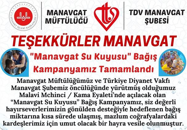 Manavgat Müftülüğümüz ve Türkiye Diyanet Vakfı Manavgat Şubemiz öncülüğünde yürütmüş olduğumuz Malavi Mchinci / Kama Eyaleti’nde açılacak olan “Manavgat Su Kuyusu” Bağış Kampanyamız, siz değerli hayırseverlerimizin gönülden desteğiyle hedeflenen bağış miktarına kısa sürede ulaşılmış, mazlum coğrafyalardaki kardeşlerimiz için umut olacak bir hayra vesile olunmuştur.