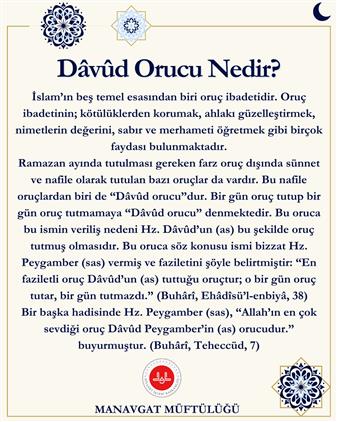 Ramazan ayında tutulması gereken farz oruç dışında sünnet ve nafile olarak tutulan bazı oruçlar da vardır. Bu nafile oruçlardan biri de “Dâvûd orucu”dur. Bir gün oruç tutup bir gün oruç tutmamaya “Dâvûd orucu” denmektedir. Bu oruca bu ismin veriliş nedeni Hz. Dâvûd’un (as) bu şekilde oruç tutmuş olmasıdır. Bu oruca söz konusu ismi bizzat Hz. Peygamber (sas) vermiş ve faziletini şöyle belirtmiştir: “En faziletli oruç Dâvûd’un (as) tuttuğu oruçtur; o bir gün oruç tutar, bir gün tutmazdı.” (Buhârî, Ehâdîsü’l-enbiyâ, 38)