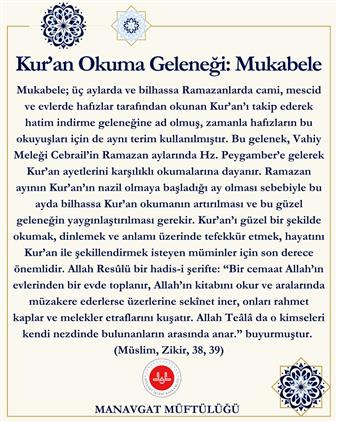 Mukabele; üç aylarda ve bilhassa Ramazanlarda cami, mescid ve evlerde hafızlar tarafından okunan Kur’an’ı takip ederek hatim indirme geleneğine ad olmuş, zamanla hafızların bu okuyuşları için de aynı terim kullanılmıştır.
