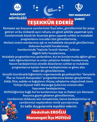 Zekât, fitre, sadaka ve bağışlarını ihtiyaç sahiplerine ulaştırılmak üzere Müftülüğümüze ve Türkiye Diyanet Vakfı Manavgat Şubesi’ne emanet eden hayırsever kardeşlerimize,